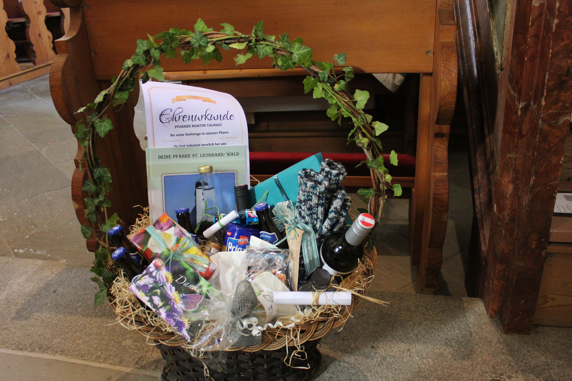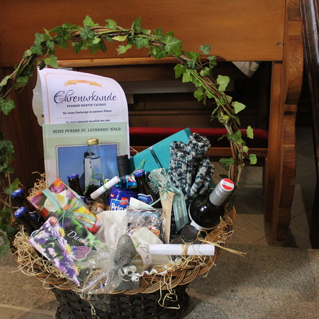 Der Pfarrgemeinderat, allen voran Obmann Stefan Fischer, überreichte eine Uhr, sowie einen Geschenkskorb mit Gegenständen, die an die Zeit in Leonhard erinnern sollen und bedankte sich somit im Namen aller LeonharderInnen für die gemeinsame Zeit in der Pfarre.