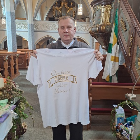 Veronika Schachinger bedankte sich im Namen aller Ministranten für die gemeinsame Zeit. Die Minis überreichten als Abschiedsgeschenk Schokolade, die mit Dankesworten und Fotos personalisiert wurde. Pfarrer Martin freute sich auch sehr über das T-Shirt, das ihn als "Der beste Pfarrer aller Zeiten" betitelt.
