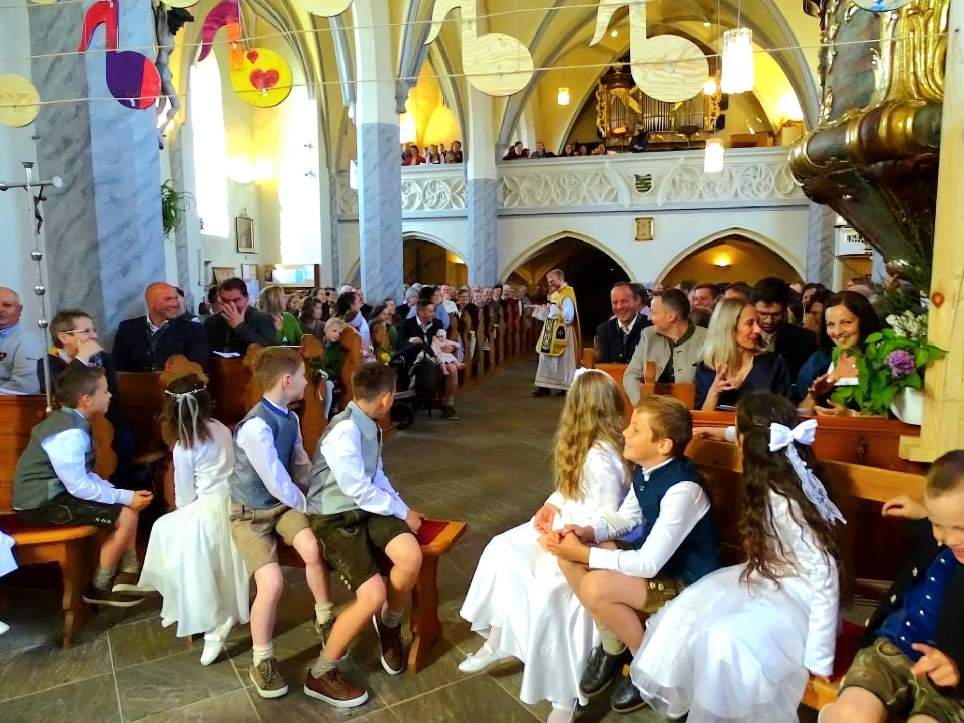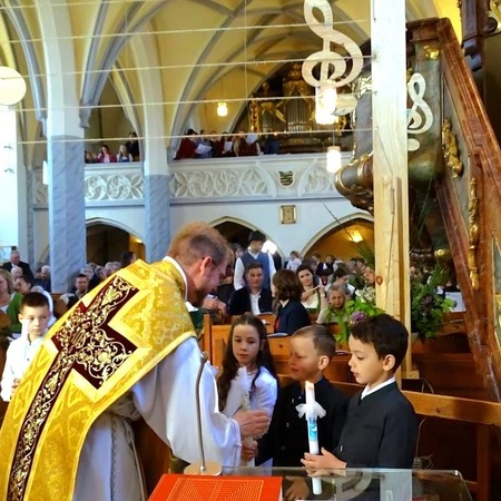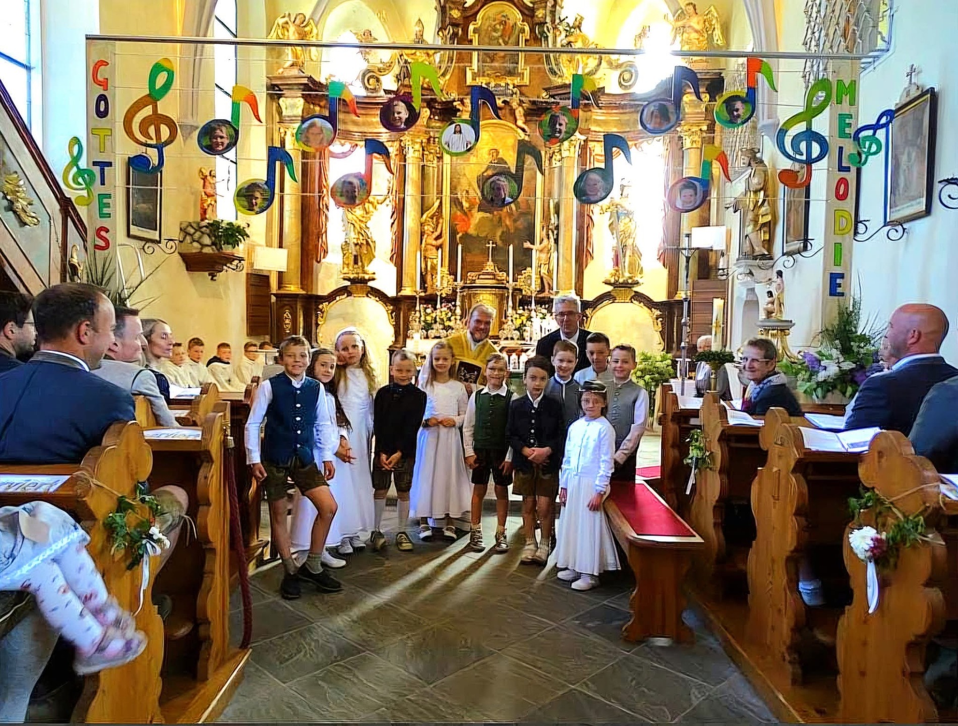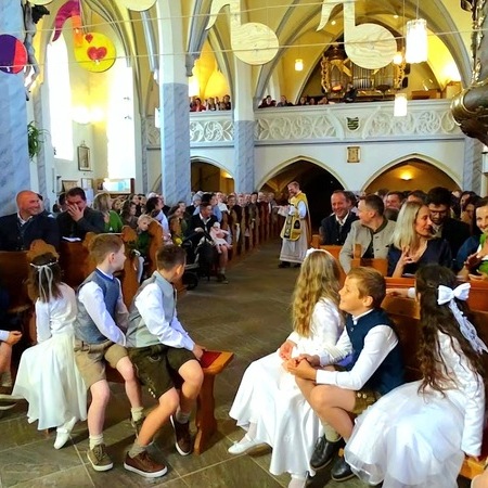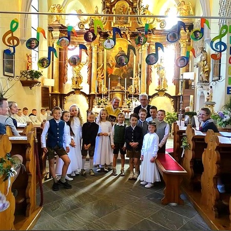 Unter dem Motto "Du bist ein Ton in Gottes Melodie" fand am 11. Mai 2025 bei strahlendem Sonnenschein die diesjährige Erstkommunion statt. Unter den Klängen der Trachtenmusikkaplle zog man gemeinsam in die feierlich geschmückte Pfarrkirche in. Die lebendige Messe, die durch die kreativen Ideen von Andreas Krenn bereichert wurde, zelebrierte Kaplan Luca. Der Jugendchor umrahmte den Gottesdienst musikalisch. Ein herzliches Dankeschön an alle, die zum Gelingen der Erstkommunion beigetragen haben!