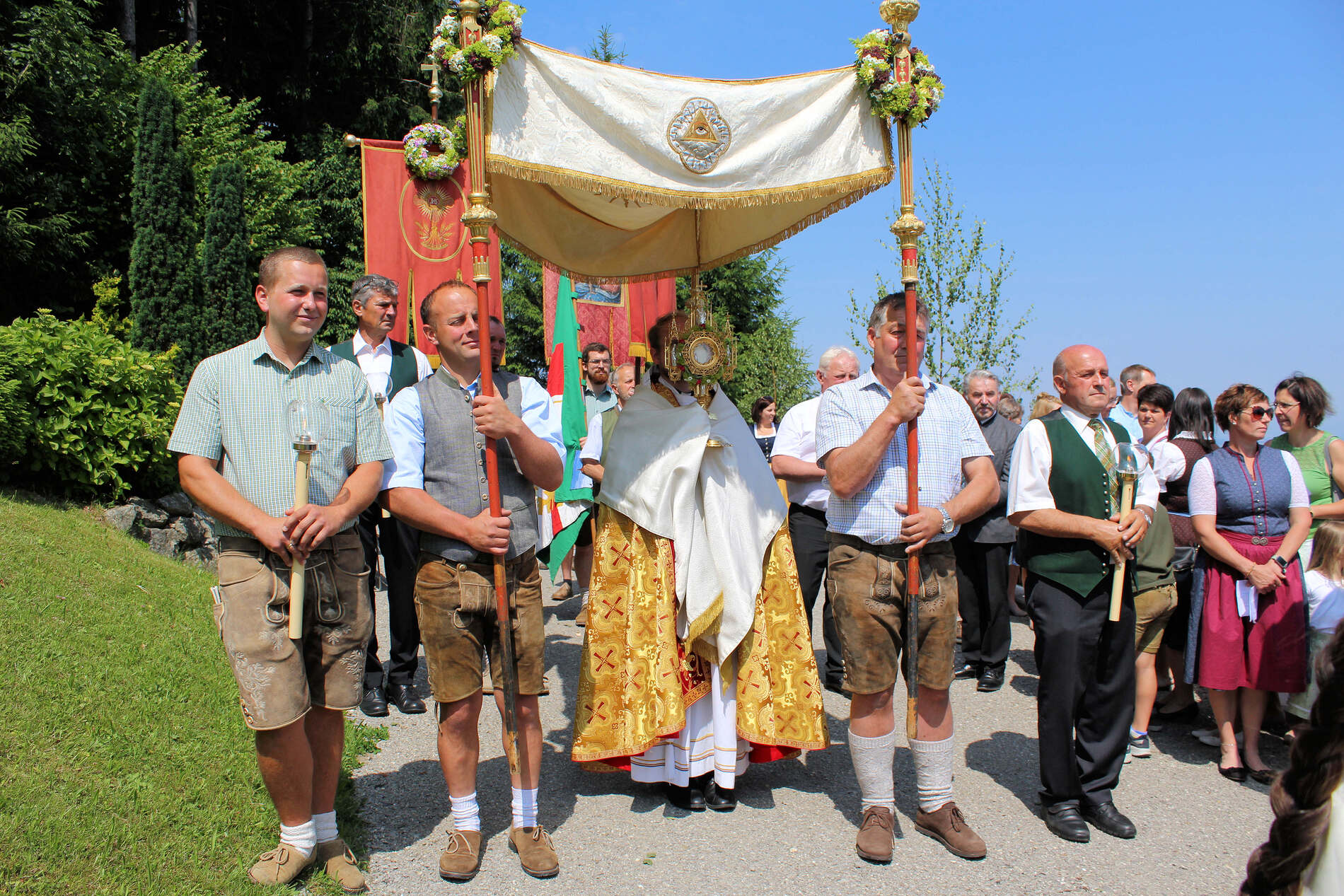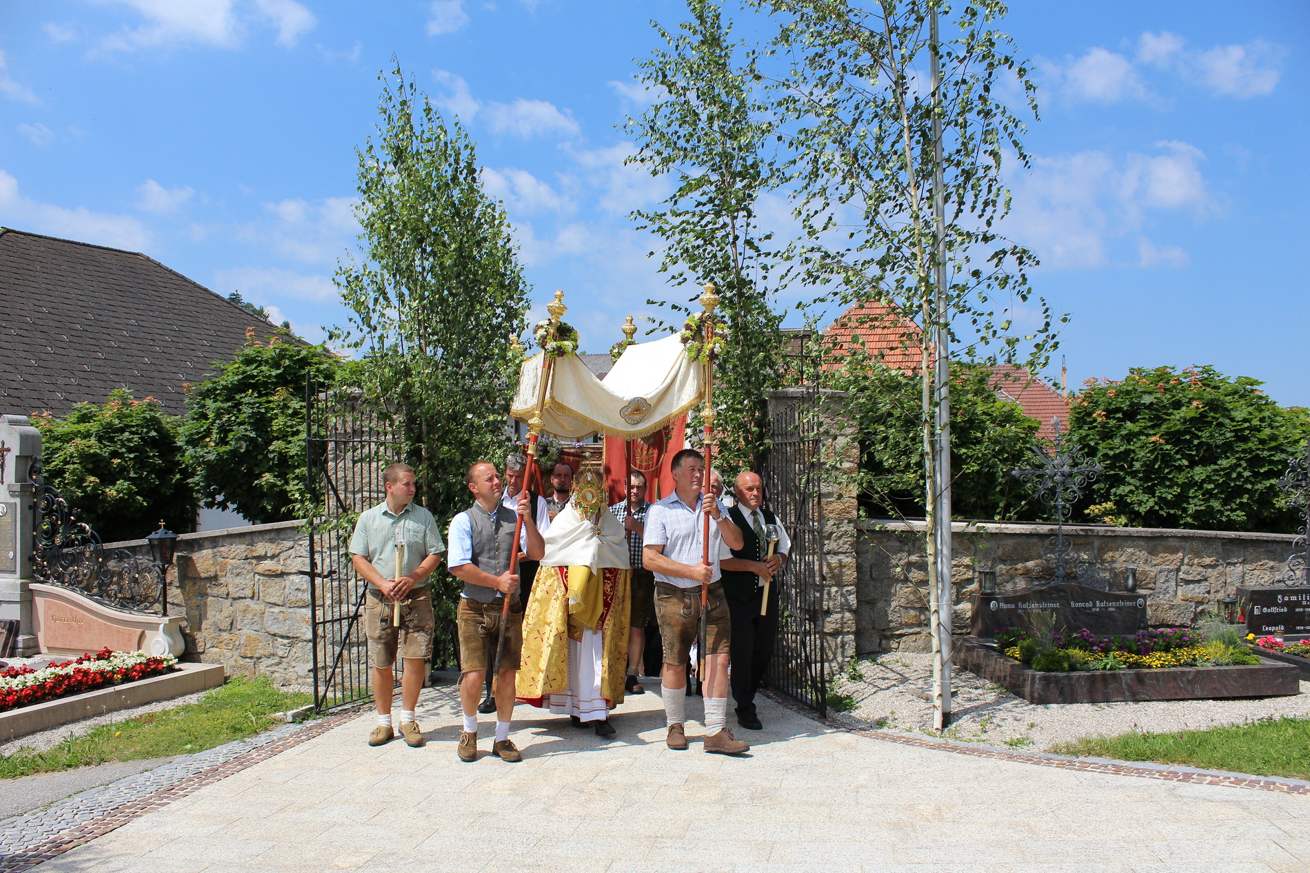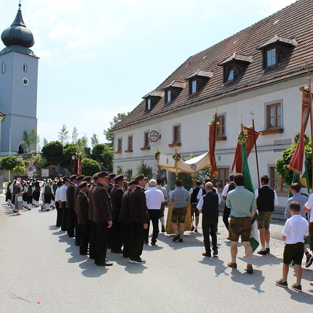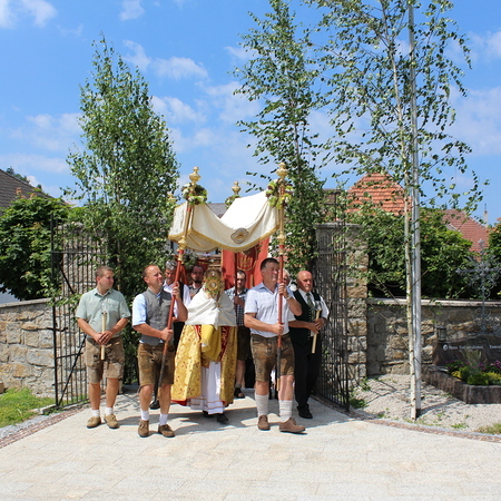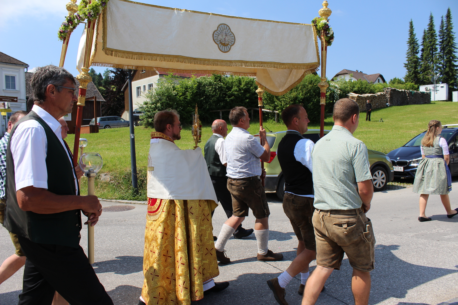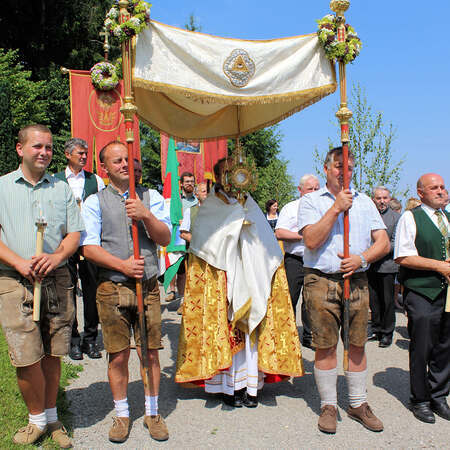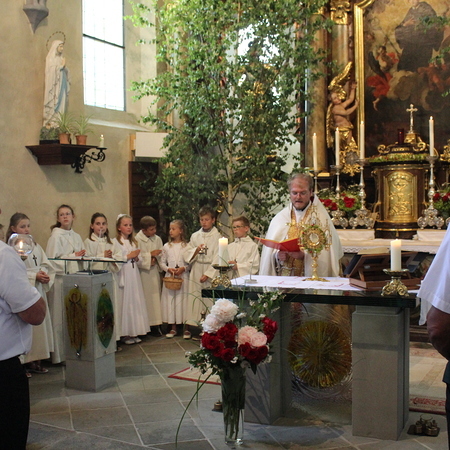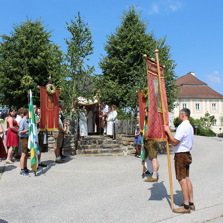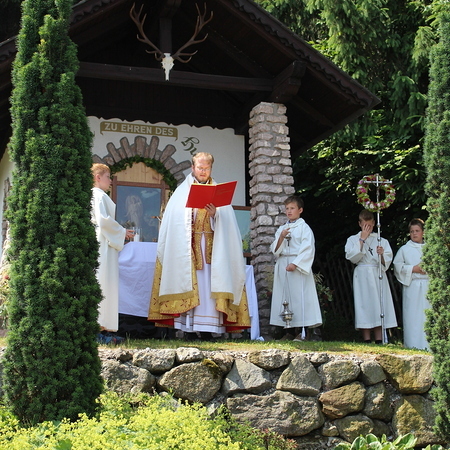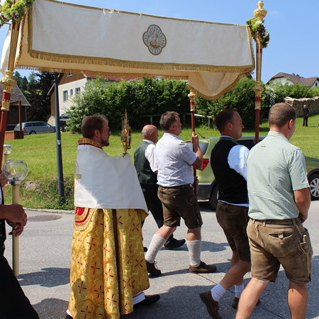 Fronleichnam, das übersetzt soviel heißt wie das "Hochfest des Leibes und Blutes Christi" wurde auch heuer wieder in Form einer Prozession durch St. Leonhard am Walde gefeiert. Gemeinsam zog Kaplan Luca mit der Pfarrgemeinde und den Vereinen von Altar zu Altar und schließlich wieder in die Pfarrkirche wo mit einem feierlichen "Großer Gott wir loben dich" begleitet von der Trachtenmusikkapelle die christliche Feier würdevoll beendet wurde.