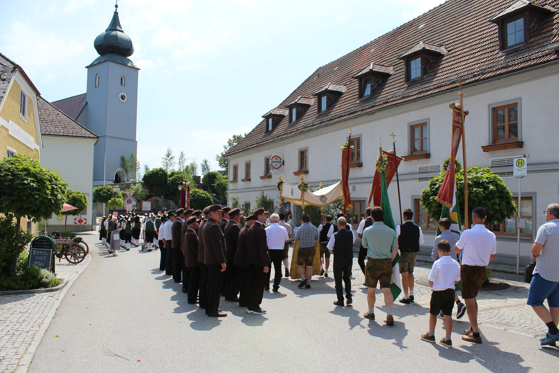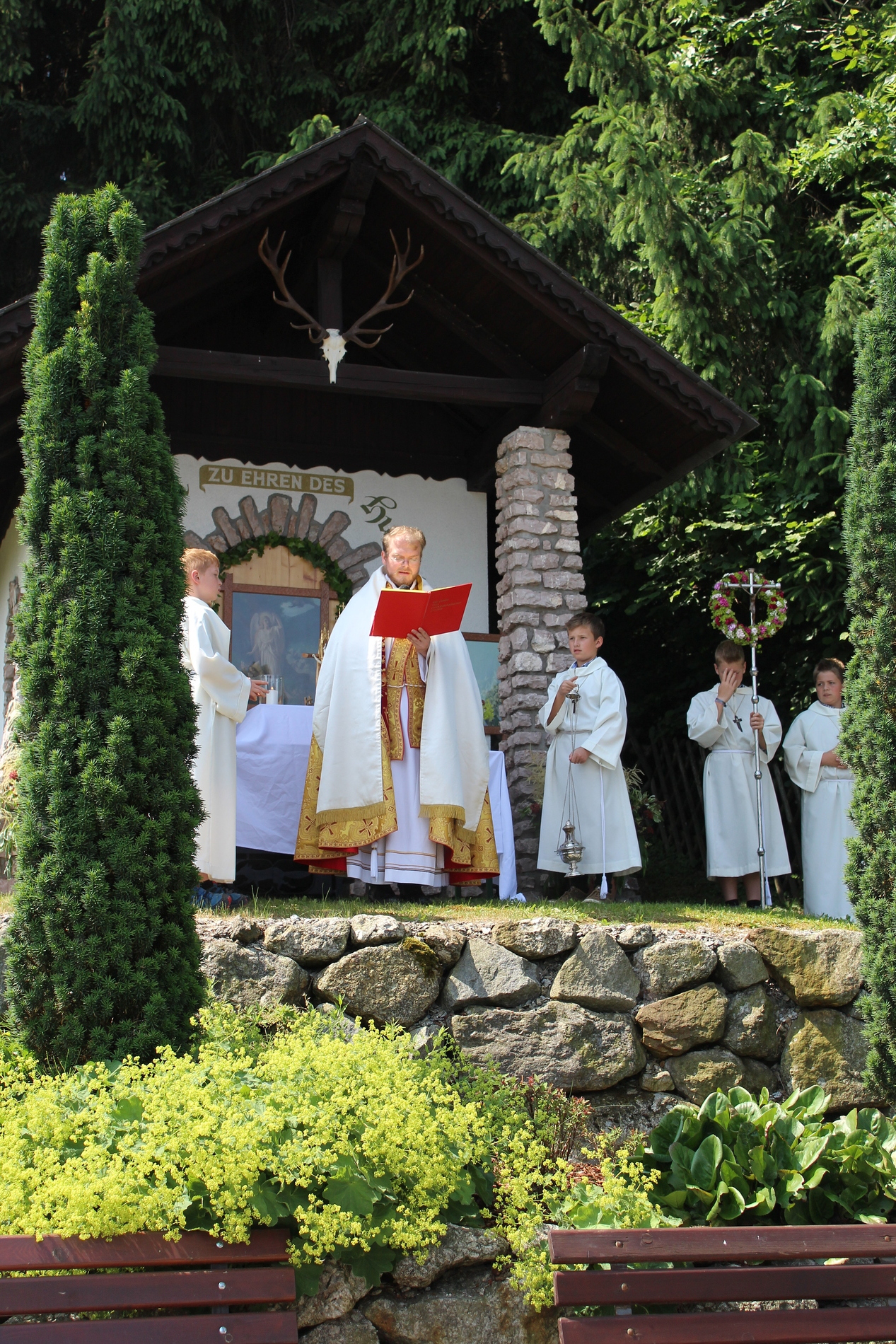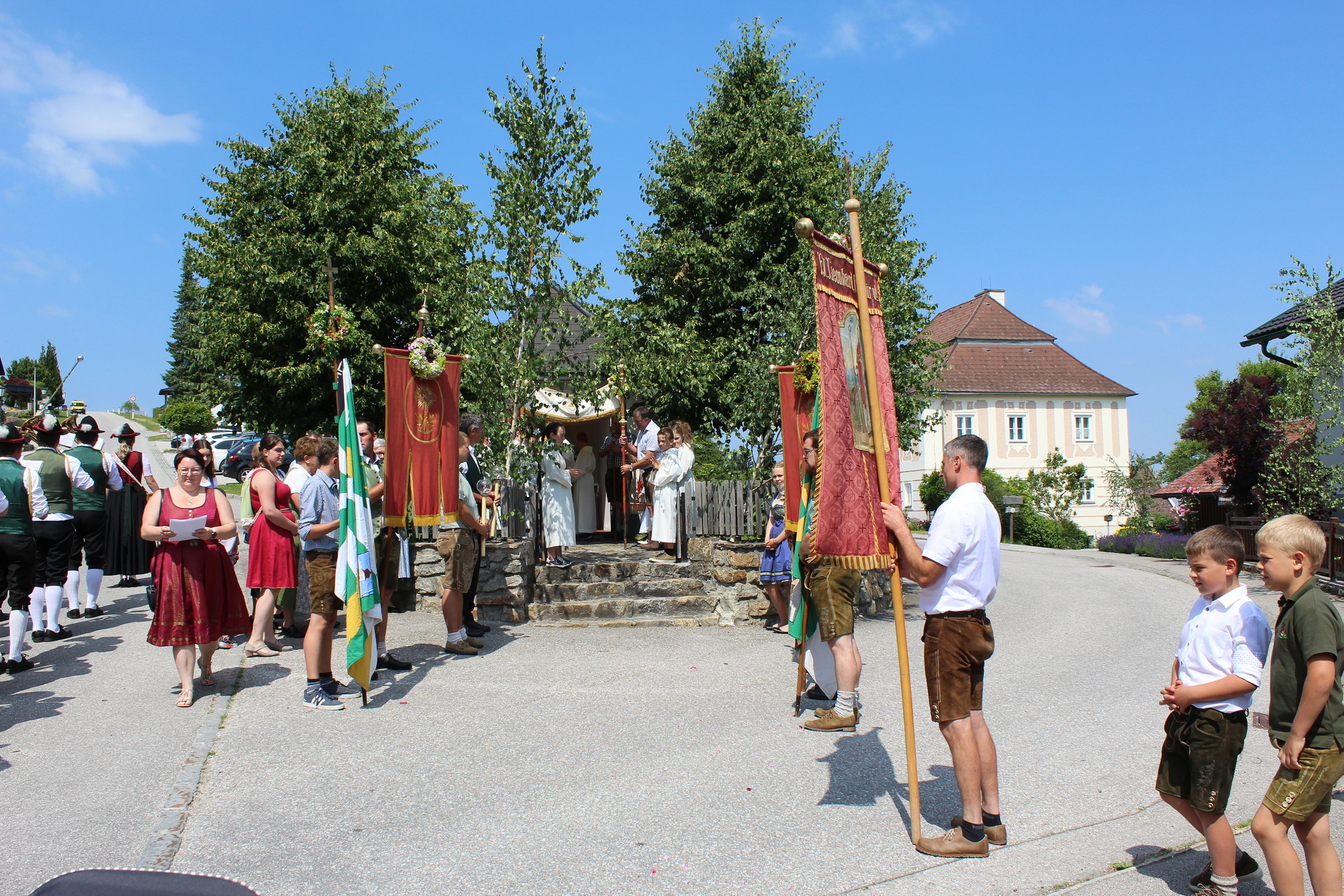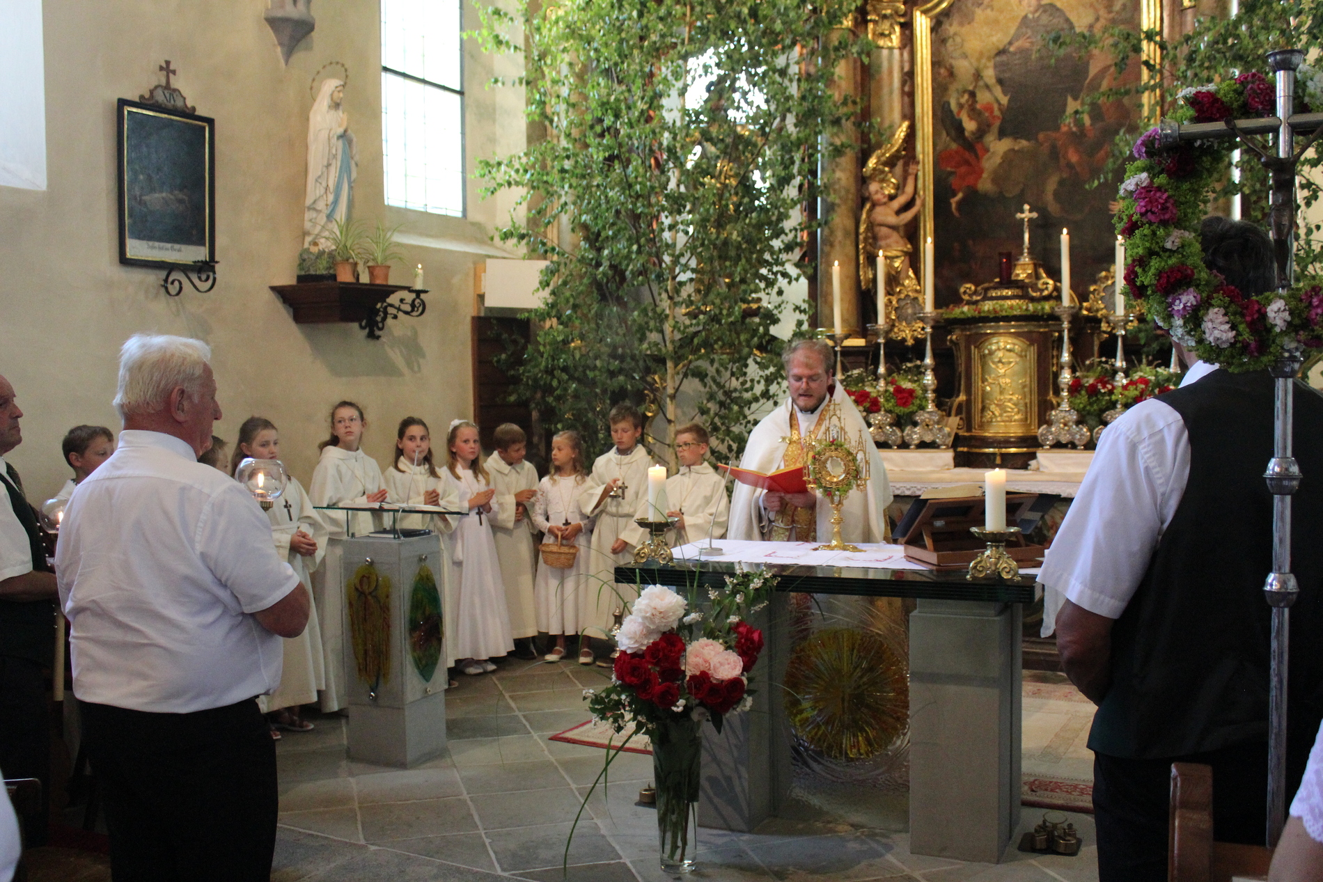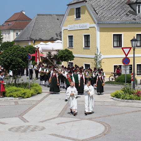 Fronleichnam, das übersetzt soviel heißt wie das "Hochfest des Leibes und Blutes Christi" wurde auch heuer wieder in Form einer Prozession durch St. Leonhard am Walde gefeiert. Gemeinsam zog Kaplan Luca mit der Pfarrgemeinde und den Vereinen von Altar zu Altar und schließlich wieder in die Pfarrkirche wo mit einem feierlichen "Großer Gott wir loben dich" begleitet von der Trachtenmusikkapelle die christliche Feier würdevoll beendet wurde.