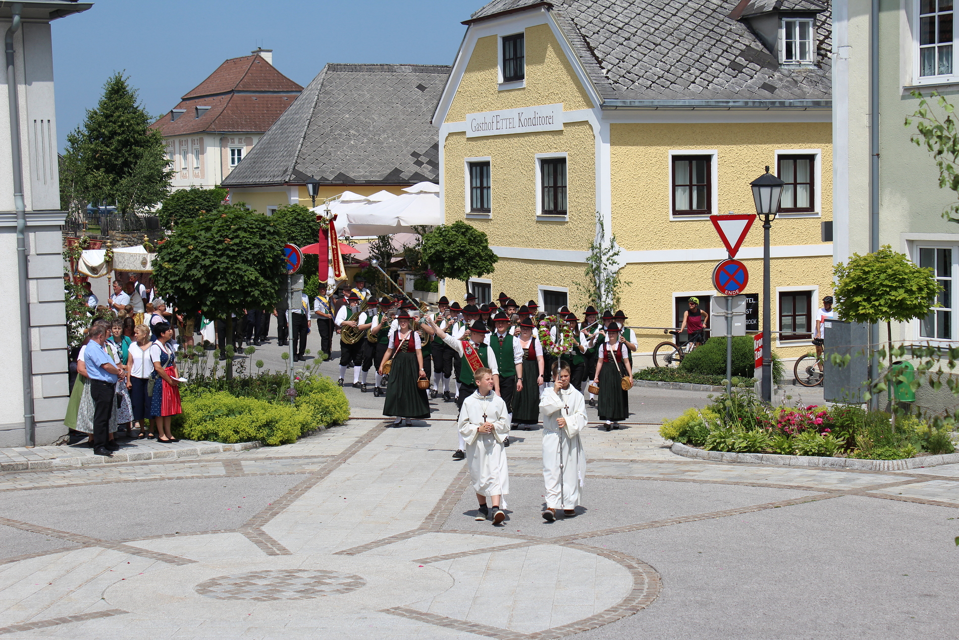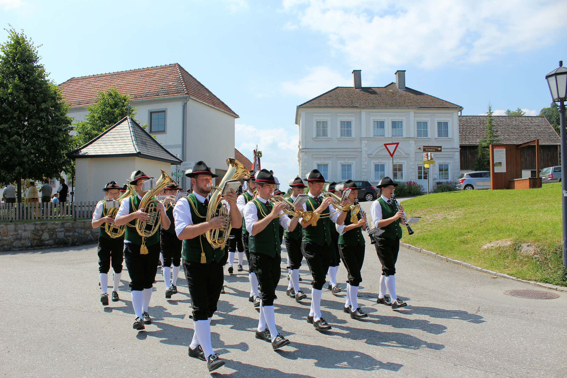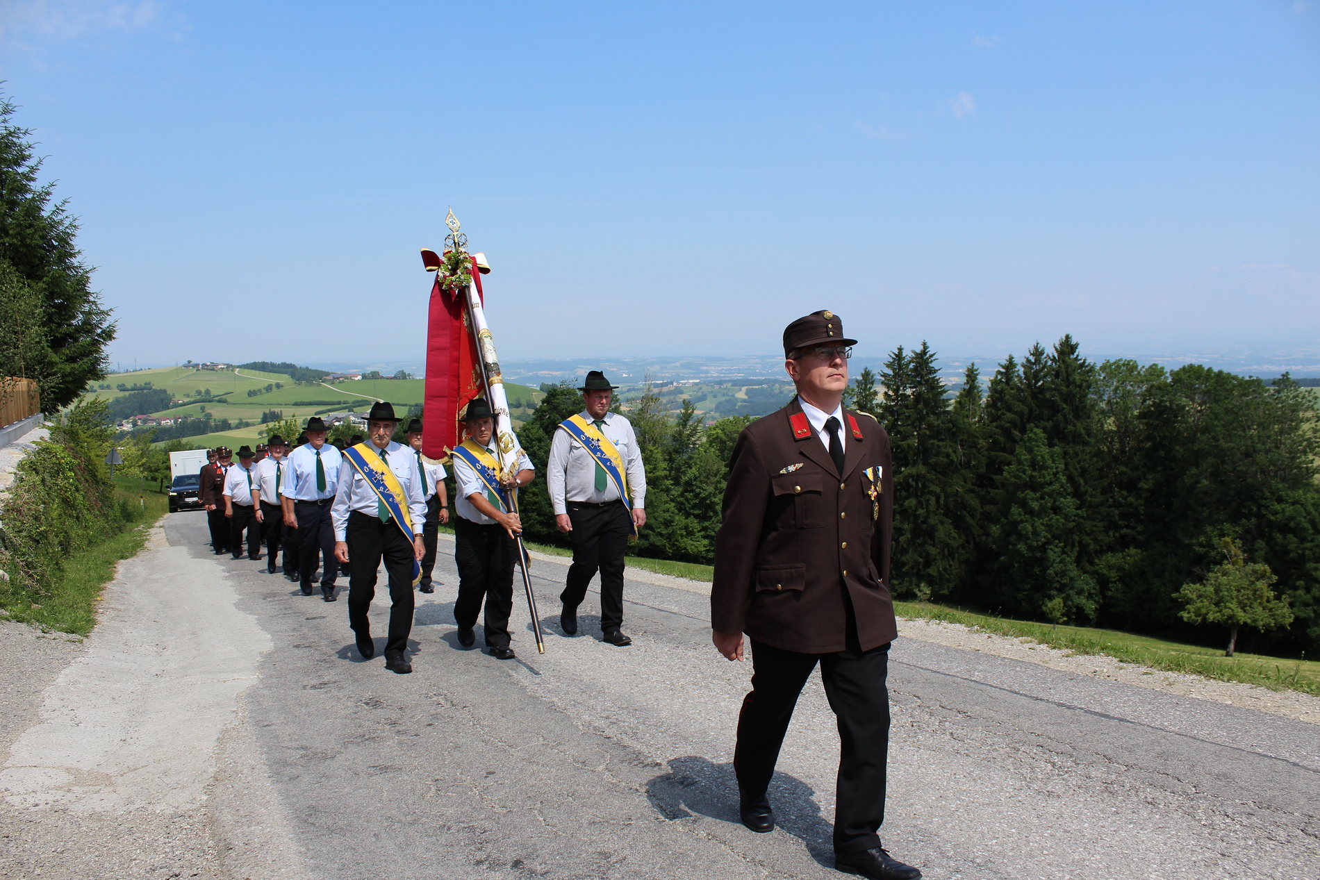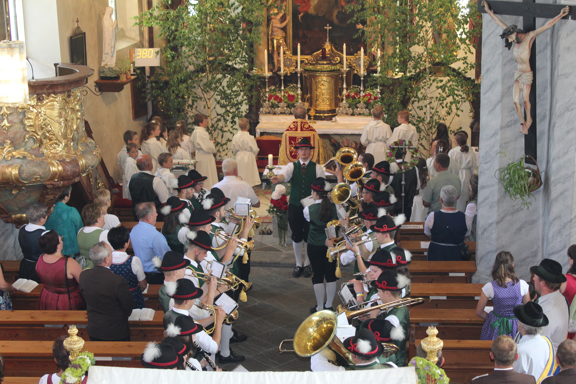 Fronleichnam, das übersetzt soviel heißt wie das "Hochfest des Leibes und Blutes Christi" wurde auch heuer wieder in Form einer Prozession durch St. Leonhard am Walde gefeiert. Gemeinsam zog Kaplan Luca mit der Pfarrgemeinde und den Vereinen von Altar zu Altar und schließlich wieder in die Pfarrkirche wo mit einem feierlichen "Großer Gott wir loben dich" begleitet von der Trachtenmusikkapelle die christliche Feier würdevoll beendet wurde.