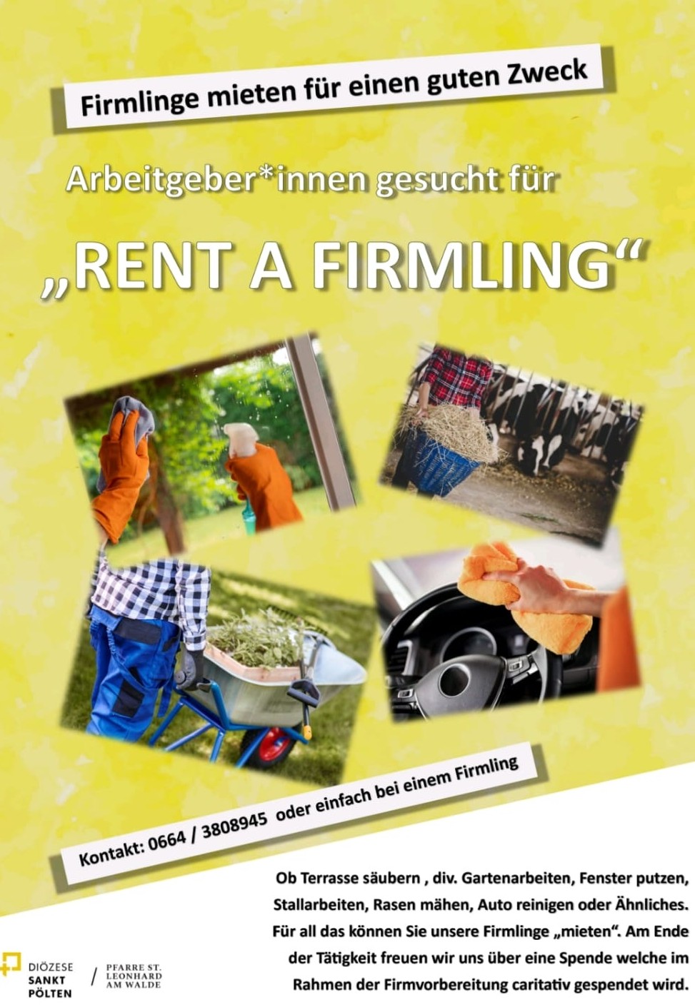 Im Rahmen der Vorstellungsmesse wurde die Aktion "Rent a Firmling" vorgestellt. Die Firmlinge der Pfarre St. Leonhard haben sich gemeinsam mit den Betreuern der Firmvorbereitung, Andreas Krenn und Bettina Übellacker, diese Aktion überlegt. Die Firmlinge können für diverse Arbeiten wie Terasse säubern, Gartenarbeiten, Fenster putzen, Rasen mähen, Stallarbeiten, Auto reinigen usw. "gemietet" werden. Am Ende der Tätigkeit freuen sich die Helfer über eine Spende welche im Rahmen der Firmvorbereitung caritativ gespendet wird. Kontaktaufnahme unter 0664/3808945 oder direkt bei einem Firmling. Die Firmlinge freuen sich auf viele ArbeitgeberInnen für den guten Zweck!
